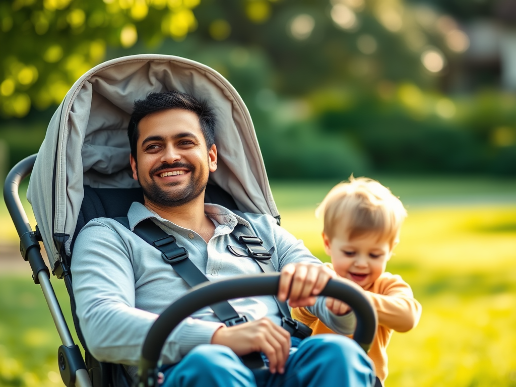 This is a picture of a dad sitting in the stroller while the toddler pushes it or walks beside it