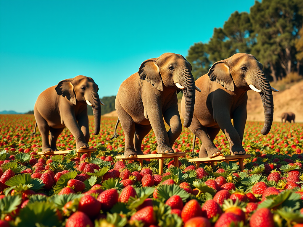 Today is Pick Strawberries Day! This is a picture of three large elephants on platforms situated in a field of strawberries.